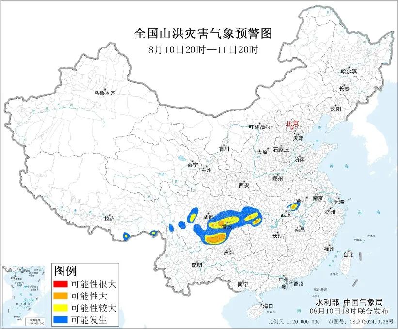 10日18時,水利部和中國氣象局聯合發佈橙色山洪災害氣象預警,預計10日20時至11日20時,湖北東部和西南部、湖南西北部、四川東南部、重慶西部、貴州西北部、雲南東北部局地發生山洪災害可能性大。