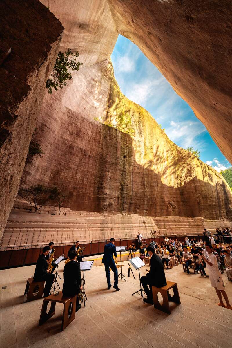 9號巖宕則是另一番境界。形似巨大的“喇叭口”,它天然具備優越的聲學效果,被改造為舞台與人文講堂。雨天,雨水從高處滴落,敲響回聲的鼓面;晴日,婺劇、薩克斯、小型音樂會在此上演,山鳴谷應之間,觀眾沉醉其間。