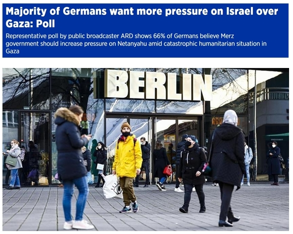 德國公共廣播聯盟(ARD)最新發布的民調結果顯示,大多數(66%)德國受訪者希望默茨政府向以色列施加更大壓力,以迫使其切實應對加沙正在發生的嚴重人道主義危機。