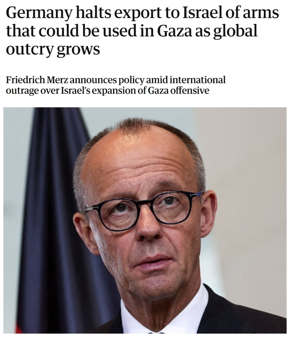 德國總理默茨日前呼籲以色列政府不要擴大在加沙的軍事行動,並表示德國將暫停向以出口任何可能用於襲擊加沙的軍事裝備。