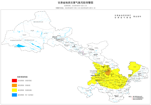甘肅省自然資源廳、甘肅省氣象局於2025年8月11日12時30分聯合發佈地質災害氣象風險預警:預計未來24小時內(8月11日12時30分至8月12日12時30分),甘肅省蘭州市(榆中縣)發生崩塌、滑坡、泥石流等地質災害的風險高(橙色預警);甘南藏族自治州(合作市、臨潭縣、卓尼縣、夏河縣),慶陽市(慶城縣、環縣、華池縣、鎮原縣),蓮花山風景林保護區,太子山天然林保護區,蘭州市(城關區、七里河區、西固區、安寧區、紅古區、永登縣、皋蘭縣),隴南市(宕昌縣、西和縣、禮縣、徽縣),定西市(安定區、通渭縣、隴西縣、渭源縣、臨洮縣、漳縣、岷縣),天水市(秦州區、麥積區、清水縣、秦安縣、甘谷縣、武山縣、張家川回族自治縣),白銀市(白銀區、會寧縣),臨夏回族自治州(臨夏市、臨夏縣、康樂縣、永靖縣、廣河縣、和政縣、東鄉族自治縣、積石山保安族東鄉族撒拉族自治縣),蘭州新區,武威市(天祝藏族自治縣),平涼市(崆峒區、莊浪縣、靜寧縣、華亭市)發生崩塌、滑坡、泥石流等地質災害的風險較高(黃色預警),請注意防範。