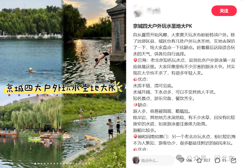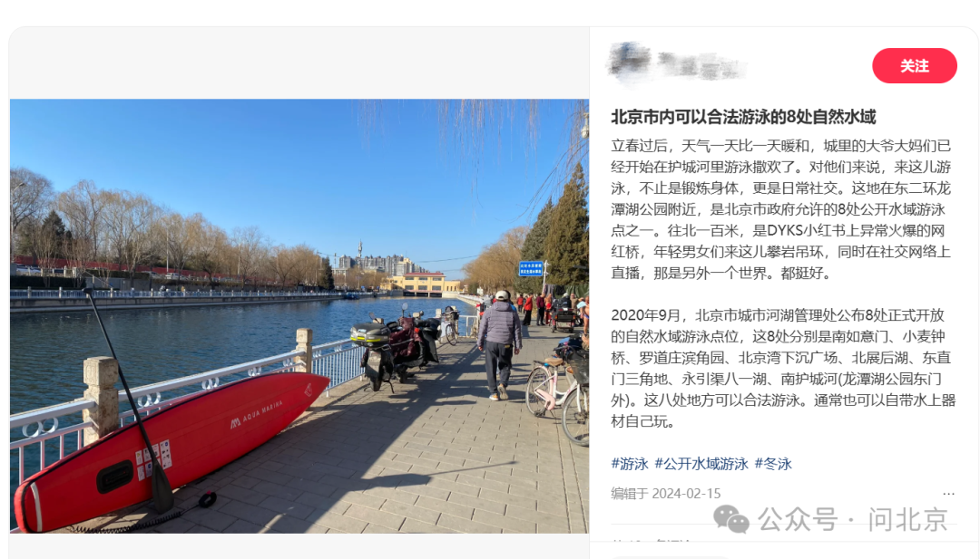 正值三伏天,烈日炎炎之下,户外水域成了市民消暑納涼的好去處。在網絡平台上搜索 “北京公開水域”“户外玩水” 等關鍵詞,便能獲取許多相關內容——“8處合法開放游泳點位”、“北京城內隱藏的天然泳池”……有的攻略不僅詳細羅列了熱門地點、注意事項、適宜活動,還總結了北京市內的“8個官方親水點”。那麼,這一表述是否準確呢?記者諮詢了東城、朝陽、西城等區的水務部門。