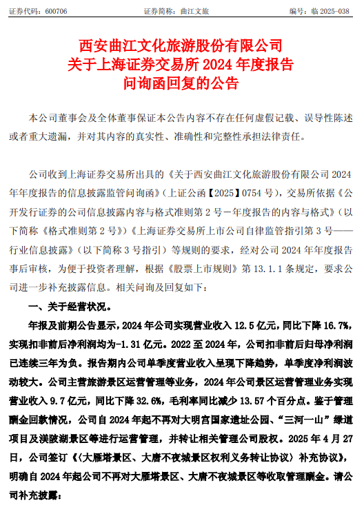 【環球網消費綜合報道】曲江文旅(600706)正面臨嚴峻的經營挑戰。該公司近日在對上海證券交易所問詢函的回覆公告中披露,已連續三年淨利潤虧損,2024年虧損額達1.31億元。更為嚴峻的是,其核心景區運營收入出現斷崖式下滑,其中曲江池遺址公園收入同比腰斬53.04%,大雁塔景區營收驟降44.56%,並已終止運營大明宮國家遺址公園等關鍵項目,引發上交所對其持續經營能力的重點關注。