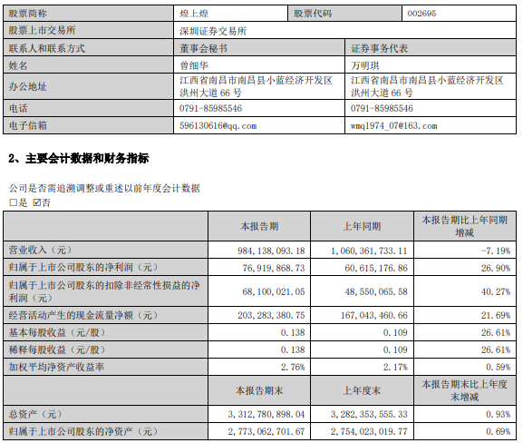 財報顯示,2025年上半年,煌上煌實現營業收入9.84億元,同比減少7622.36萬元,降幅為7.19%。然而,其歸母淨利潤卻達到7691.99萬元,同比大幅增長26.90%,扭轉了去年同期的下滑態勢。