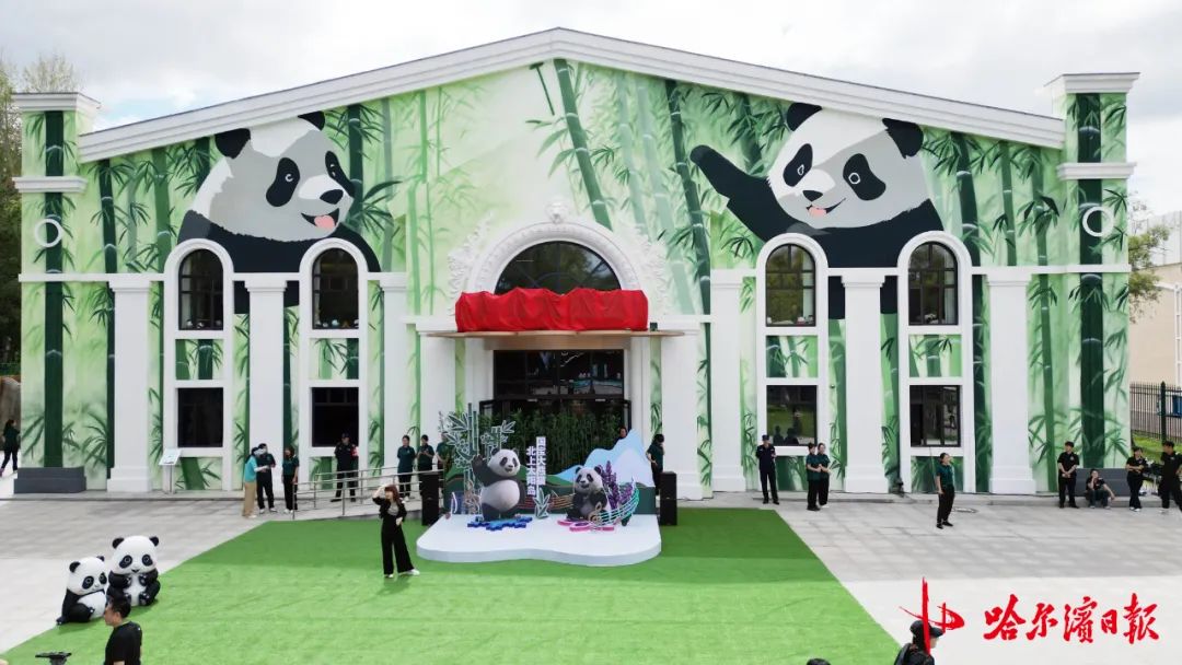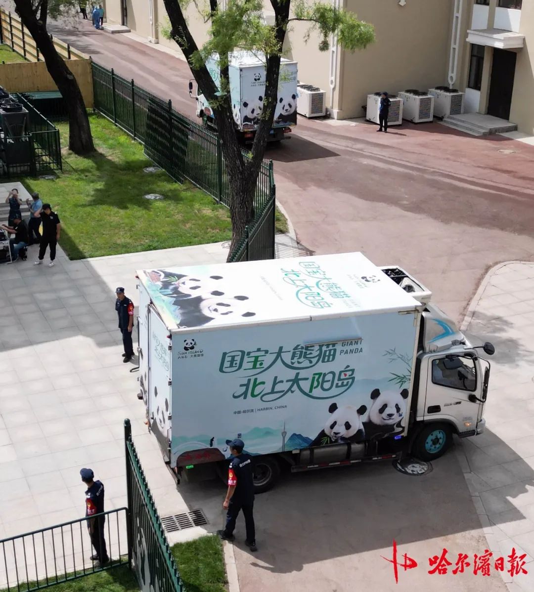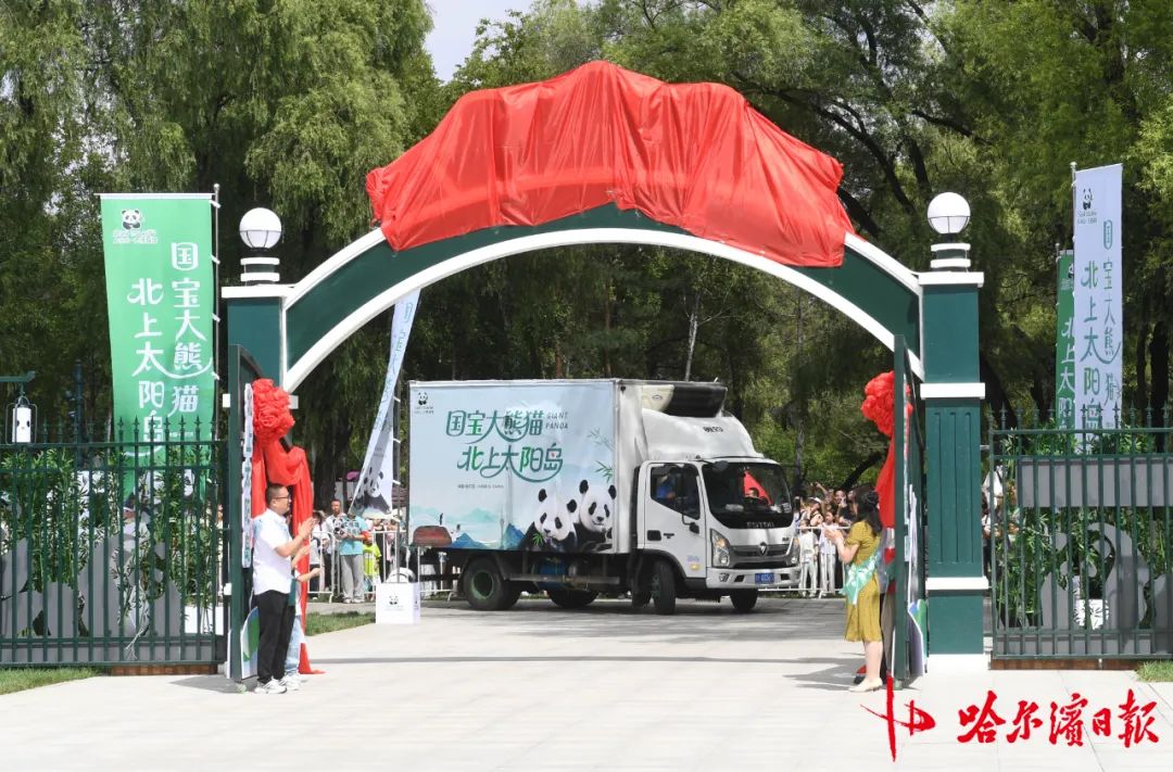 當車輛臨近大熊貓館,來自不同行業的代表打開大門,迎接車隊。隨後,車隊奔向“芝麻”和“芝士”宿舍。當車輛挺穩後,工作人員解開車內的固定裝置,而後輕輕把熊貓轉運籠卸下車。兩隻可愛的大熊貓,終於抵達了它們在哈爾濱的新家。