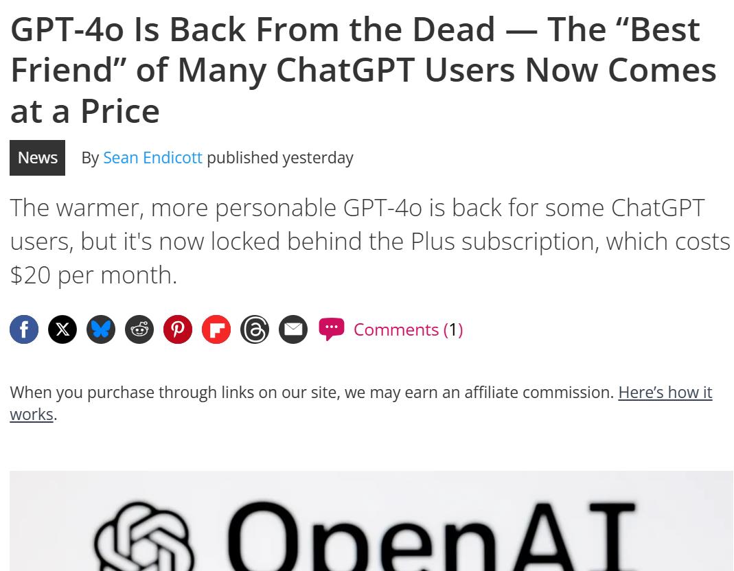 外媒:OpenAI恢復 GPT-4o 等舊模型,但仍需付費