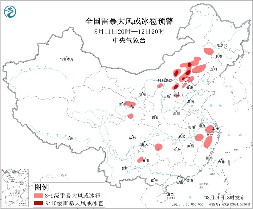 預計8月11日20時至12日20時,內蒙古東南部、華北北部、西北地區東部、西南地區東部、江南東部等地的部分地區將有8級以上雷暴大風或冰雹天氣,其中,內蒙古東南部、河北中北部、北京西北部等地的部分地區將有10級以上雷暴大風;內蒙古東部、華北中北部、西北地區東部、江淮、江漢、江南東部、西南地區東部和南部、華南南部等地的部分地區將有小時雨量大於20毫米的短時強降水天氣,其中,河北北部、湖北南部、湖南北部、浙江中北部、重慶東南部、貴州西南部和東北部等地的部分地區小時雨量大於50毫米,最大可達70毫米以上。