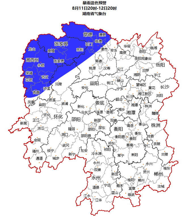 具體來看,11日晚上到12日白天,湘西、湘北多雲有小到中等陣雨或雷陣雨,湘西州、張家界、常德中北部、懷化北部大到暴雨,湘西州(鳳凰、花垣、古丈、永順)、張家界(桑植)、常德(石門、澧縣)大暴雨,其他地區晴天間多雲;12日晚上到13日白天,湘中以北陰天有小到中雨,湘西州、張家界、常德、懷化中北部、益陽、岳陽北部大雨,湘西州(吉首、鳳凰、瀘溪、古丈)、張家界(市區、慈利)、常德(石門、桃源、市區、津市、澧縣、臨澧)、懷化(麻陽、辰谿、漵浦、沅陵、市區)暴雨,其他地區多雲有陣雨或雷陣雨;13日晚上到14日白天,湘中、湘南陰天部分地區有中到大雨,永州(新田、寧遠、藍山)、郴州(市區、臨武、嘉禾、桂陽、宜章、汝城)暴雨,其他地區陰天間多雲有陣雨或雷陣雨。