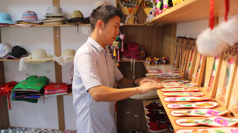 從外地返鄉的“90後”扶銀廷和妻子,在田鋪大壪創辦了一家“文創工坊”。“像鞋墊、虎頭枕、虎頭帽這些手工製品,都是我們當地一些老人、大姐手工做的。這些特色的文創產品既能讓遊客瞭解當地本土文化,又增加了村民收入。”扶銀廷説。