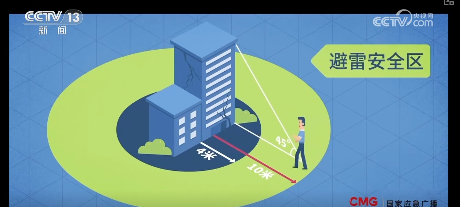 如果躲在山洞裏,千萬不要站在洞口或岩石邊,儘量往裏走。如果實在無處可躲,周圍都是大樹或廢棄高樓,應儘快尋找安全避雷區。方法很簡單,仰望視野中較高物體的頂點,視角達到45度以上,且人與物體距離4米以上,10米以內的區域就是避雷安全區。