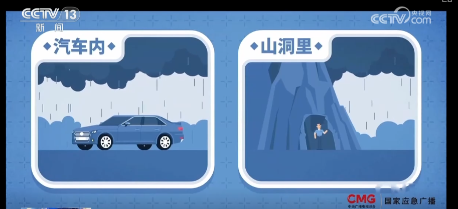 工作人員提示,如果雷雨天人在户外實在找不到合適的躲避場所時,待在車裏相對來説也是安全的。駕駛員可以選擇在安全區域停車,關掉音響等系統,並關閉所有車窗,使車輛形成一個完全封閉的空間。不要去觸摸車窗把手、換擋桿、方向盤等,儘量把雙手放在大腿上。如車輛遭遇雷擊,不要貿然下車,在車內等待救援。