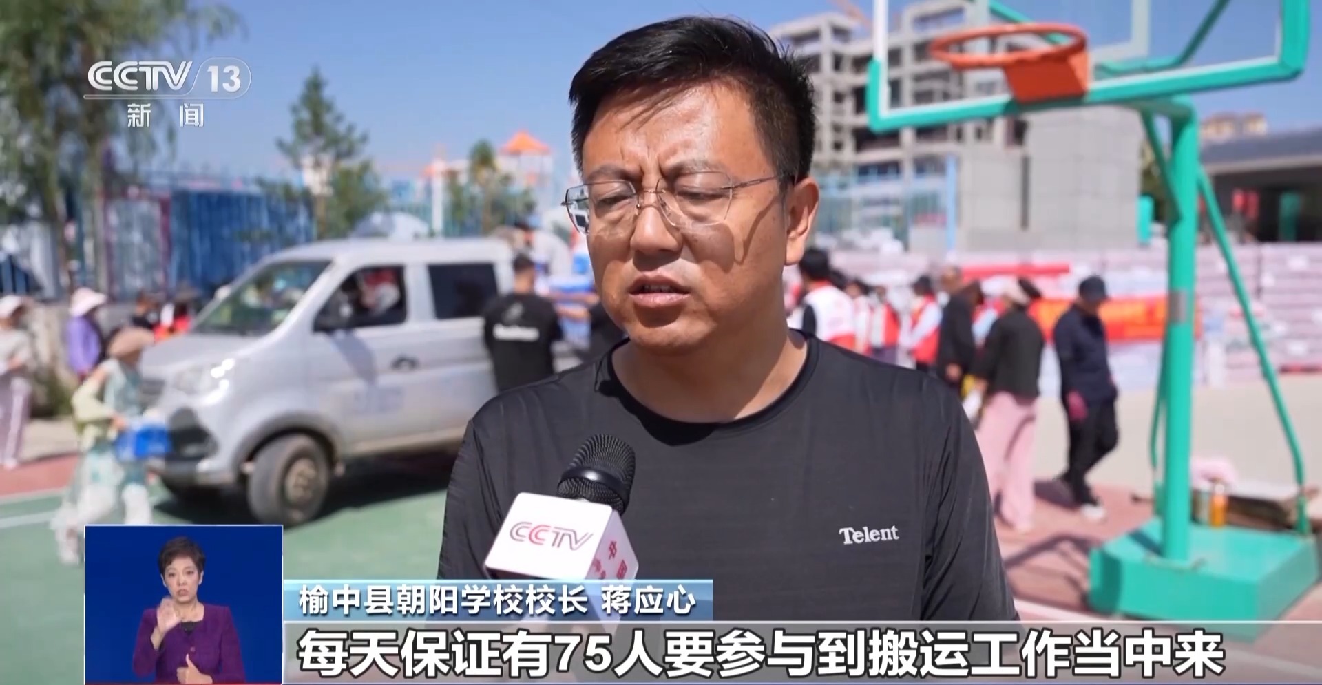 *榆中縣朝陽學校校長 蔣應心:*現在我們每天分成3班倒,每天保證有75人要參與到搬運工作當中來。