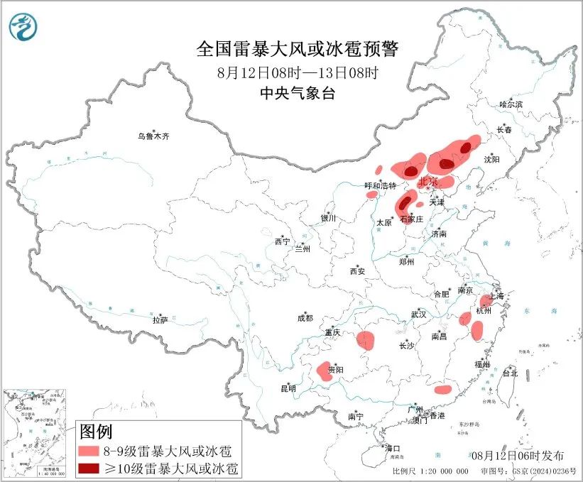 中央氣象台8月12日06時繼續**發佈強對流天氣藍色預警:預計8月12日08時至13日08時,內蒙古東南部、華北中北部、西南地區東部、江南東部等地的部分地區將有8級以上雷暴大風或冰雹天氣,其中,內蒙古東南部、山西東北部、河北中北部等地的部分地區將有10級以上雷暴大風;內蒙古東部、華北中北部、江淮、江漢、江南中東部、西南地區東部和南部、華南東部和南部等地的部分地區將有小時雨量大於20毫米的短時強降水天氣,其中,內蒙古東南部、河北中部和東北部、湖北南部、湖南西北部、浙江北部、貴州西南部、廣東中部和西南部、海南島東北部等地的部分地區小時雨量大於50毫米,最大可達60毫米以上。