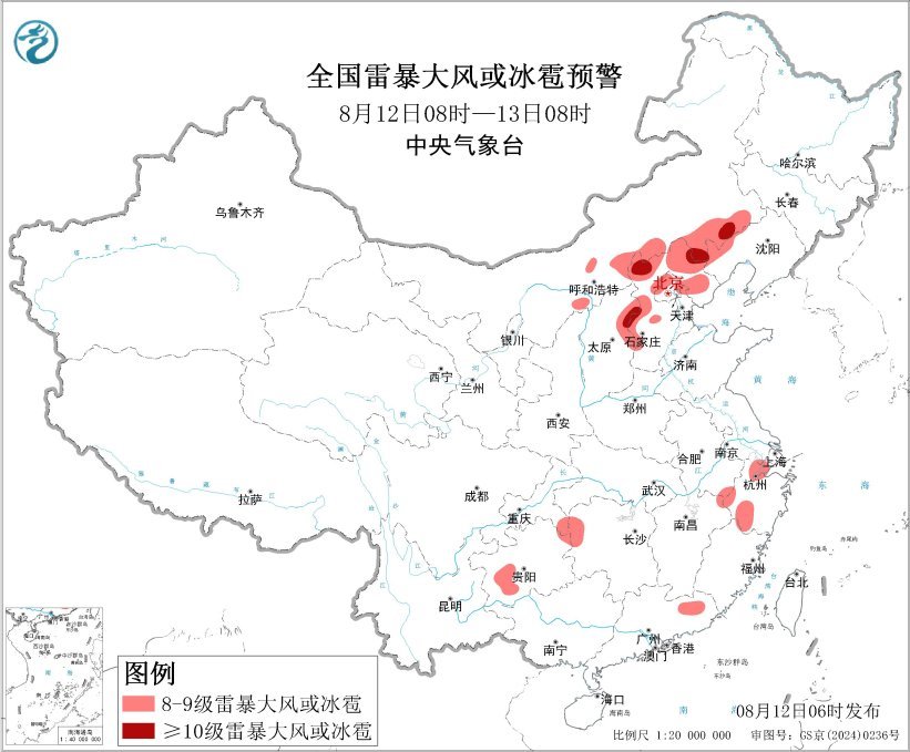 預計8月12日8時至13日8時,內蒙古東南部、華北中北部、西南地區東部、江南東部等地的部分地區將有8級以上雷暴大風或冰雹天氣,其中,內蒙古東南部、山西東北部、河北中北部等地的部分地區將有10級以上雷暴大風;內蒙古東部、華北中北部、江淮、江漢、江南中東部、西南地區東部和南部、華南東部和南部等地的部分地區將有小時雨量大於20毫米的短時強降水天氣,其中,內蒙古東南部、河北中部和東北部、湖北南部、湖南西北部、浙江北部、貴州西南部、廣東中部和西南部、海南島東北部等地的部分地區小時雨量大於50毫米,最大可達60毫米以上。