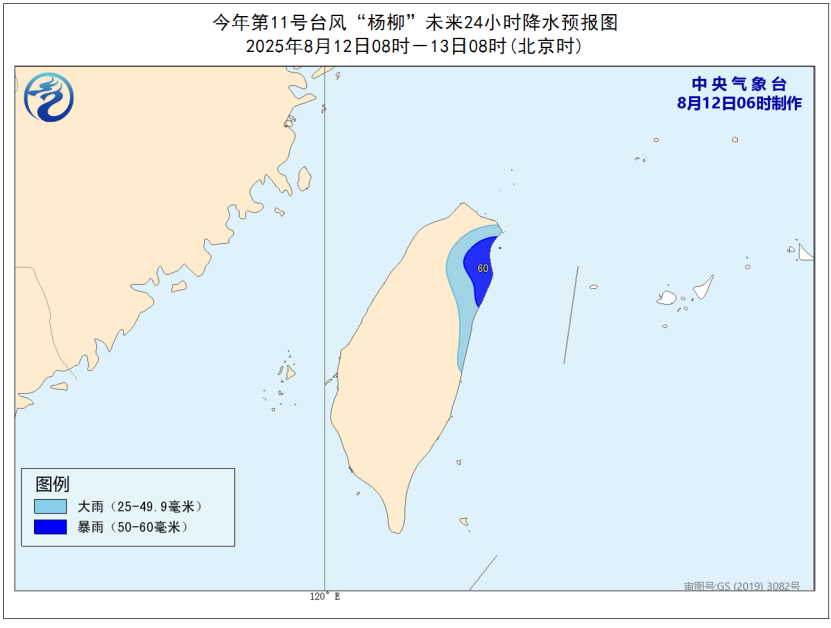 *降水預報:*8月12日8日至13日8時,台灣島東北部地區將有大到暴雨(50~60毫米)。