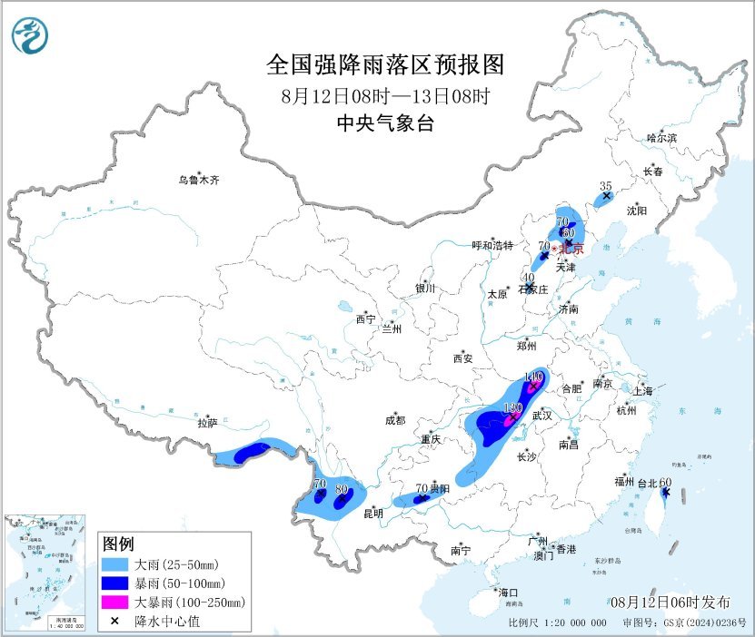 預計,8月12日8時至13日8時,河南南部、湖北中部和西南部、湖南西部和北部、貴州東部和南部、雲南北部、河北西部和東北部、北京西部和北部、天津北部、台灣島東北部、西藏東南部等地部分地區有大到暴雨,其中,河南南部、湖北東北部和西南部、湖南北部等地部分地區有大暴雨(100~140毫米)。上述部分地區伴有短時強降水(最大小時降雨量20~50毫米,局地可超過60毫米),局地有雷暴大風等強對流天氣。
