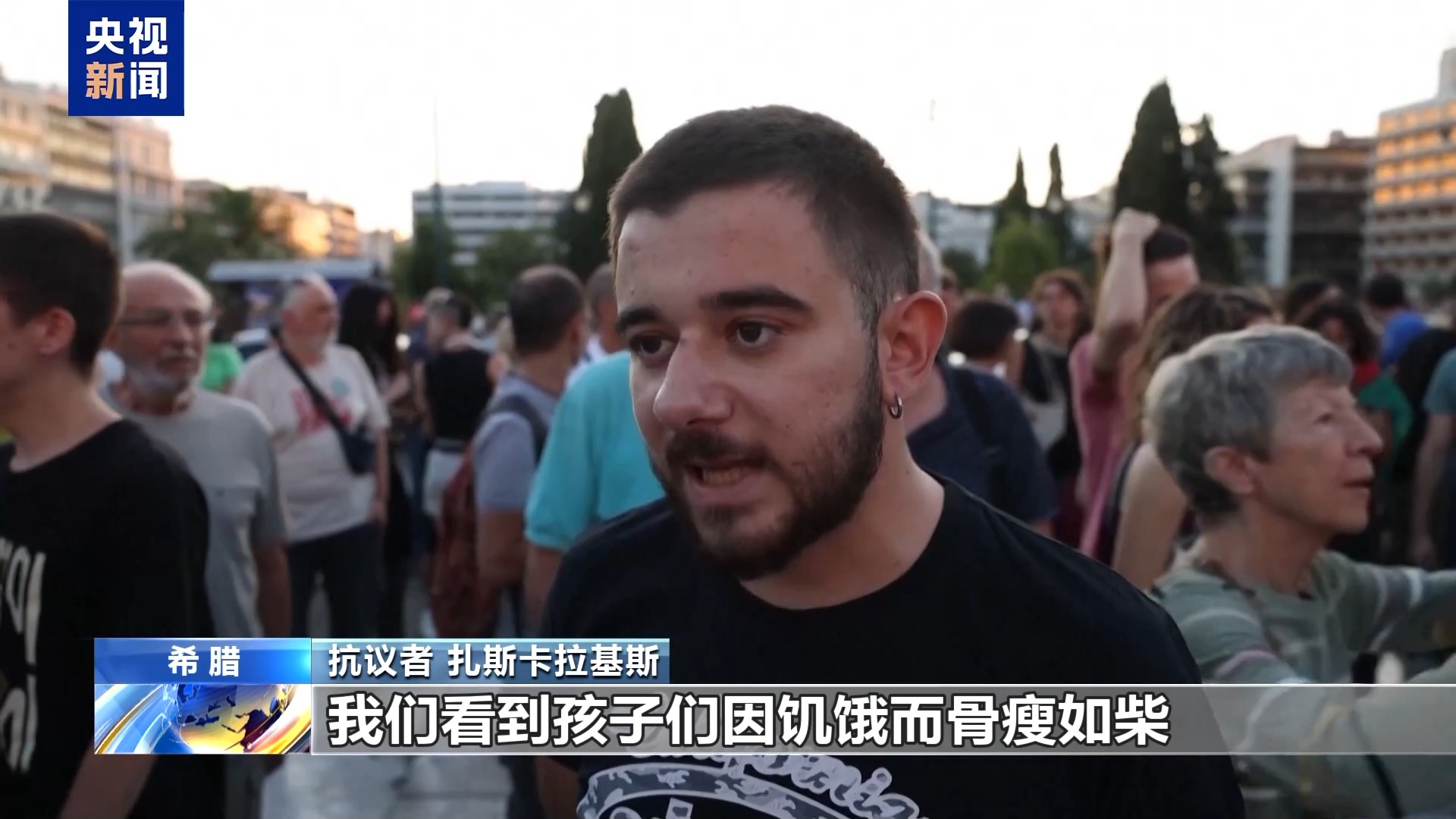 *抗議者扎斯卡拉基斯:*我們看到以色列現在在加沙製造的饑荒,我們看到孩子們因飢餓而骨瘦如柴,現在我們又聽到以色列總理內塔尼亞胡談論全面佔領加沙地帶。面對這一切,希臘人民已經提出了抗議,並將繼續提出抗議。我們與巴勒斯坦站在一起,我們始終與巴勒斯坦站在一起。