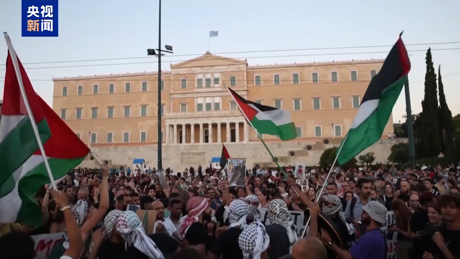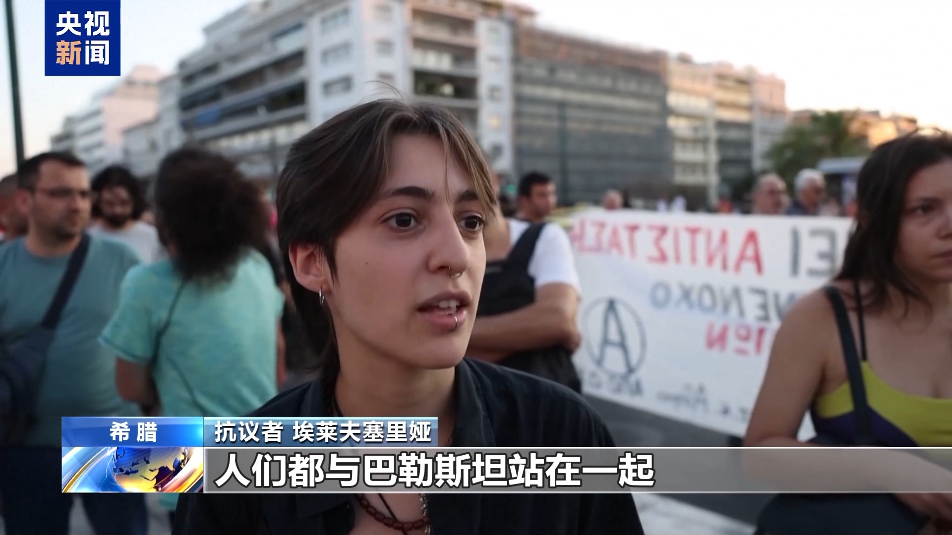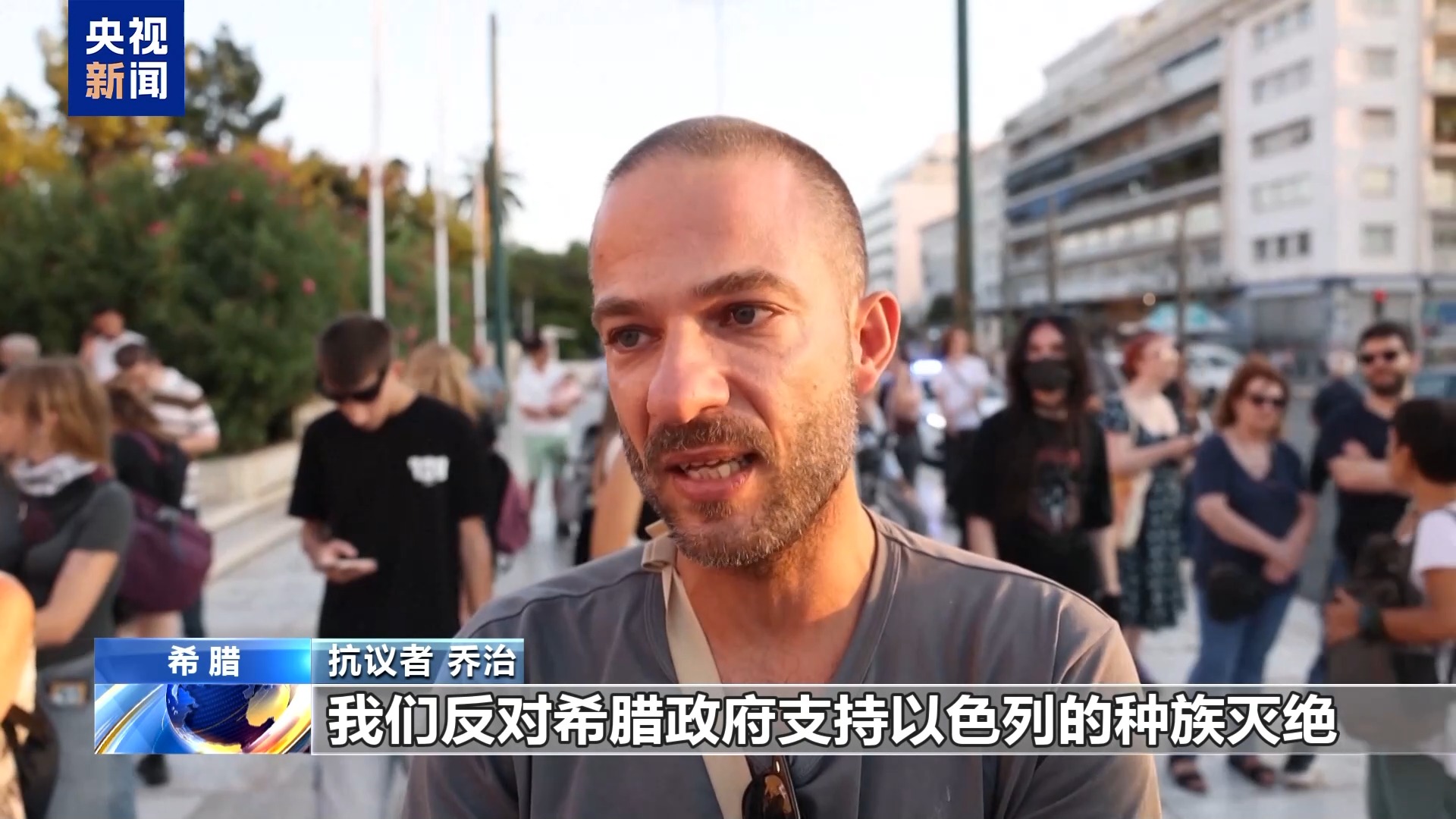 *抗議者 埃萊夫塞裏婭:*在憲法廣場、在希臘各地,人們都與巴勒斯坦站在一起,反對以色列犯下的種族滅絕罪行。我們不會放手不管,我們不會讓希臘政府繼續支持以色列,繼續跟以色列沆瀣一氣。