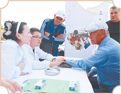 合作中心內,霍爾果斯市人民醫院(國門醫院)的義診點人山人海。伊犁哈薩克自治州中醫醫院主治醫師劉飛和同事們正忙着接診。