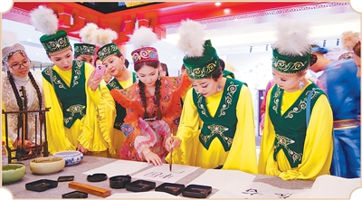中哈霍爾果斯國際邊境合作中心中國文化館內,中哈兩國青少年參加文化交流活動。永程帆攝