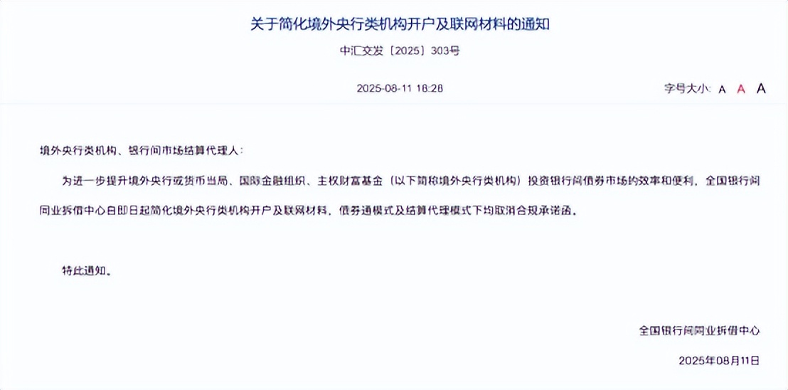 同日,全國銀行間同業拆借中心也發佈《關於簡化境外央行類機構開户及聯網材料的通知》,宣佈自8月11日起,取消債券通模式及結算代理模式下境外央行類機構開户及聯網所需的合規承諾函,以提升境外央行或貨幣當局、國際金融組織、主權財富基金(統稱“境外央行類機構”)投資銀行間債券市場的效率和便利性。