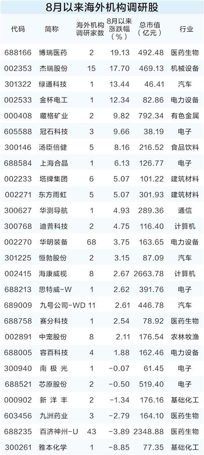 行業方面,8月以來電子、醫藥生物行業的個股較受海外機構關注,調研個股數分別為5只、4只;其次是電力設備、汽車行業,均有3只。