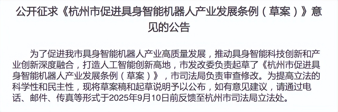 【環球網財經綜合報道】杭州市司法局8月11日起就《杭州市促進具身智能機器人產業發展條例(草案)》公開徵求意見。該草案針對具身智能機器人產業的技術特性與發展規律,提出探索構建分級分類監管體系與沙盒監管機制,建立包容審慎、鼓勵創新的監管生態,以激發各類主體創新活力。