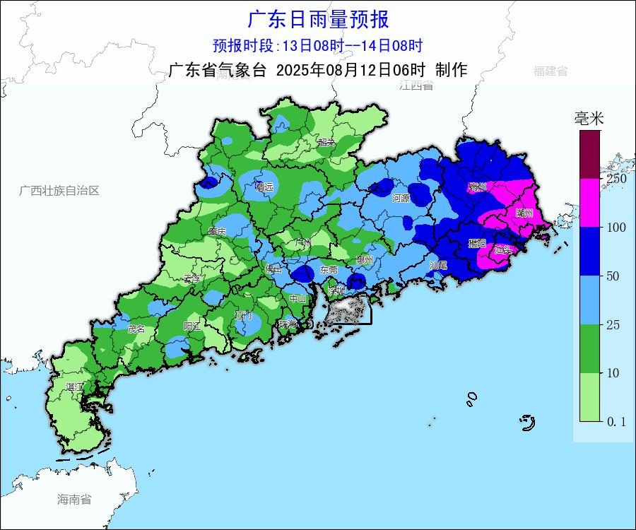 梅州和粵東市縣中到強雷雨轉暴雨局部大暴雨,其餘市縣有中到強雷雨,局部暴雨,雷雨時部分市縣有8~10級短時大風,最大時雨量100毫米左右。