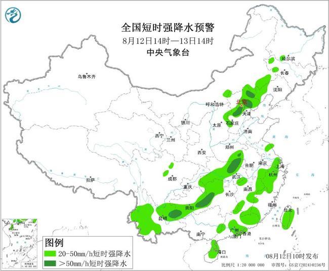 預計8月12日14時至13日14時,內蒙古東南部、華北中北部、西南地區東部、江南東部等地的部分地區將有8級以上雷暴大風或冰雹天氣,其中,北京北部、天津北部等地的部分地區將有10級以上雷暴大風,最大風力可達11級以上;內蒙古東部、華北中北部、江淮西部、江漢、江南西北部和中東部、西南地區東部和南部、華南東部和南部等地的部分地區將有小時雨量大於20毫米的短時強降水天氣,其中,河北中部和東北部、北京西南部和北部、天津北部、河南南部、湖北北部、湖南西部、貴州東南部和西南部、雲南東部等地的部分地區小時雨量大於50毫米,最大可達70毫米以上。