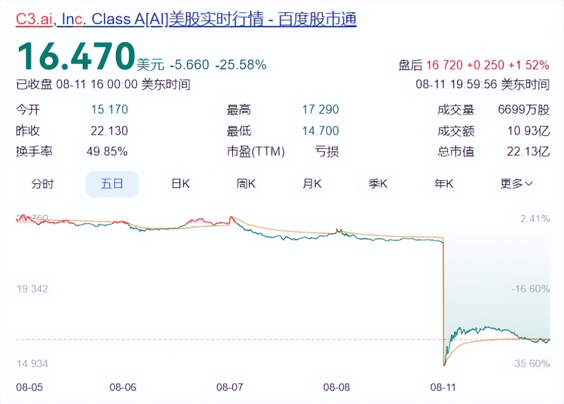 【環球網財經綜合報道】當地時間8月11日,AI軟件供應商C3.ai股價盤中一度暴跌超30%,截至收盤跌幅達25.58%。