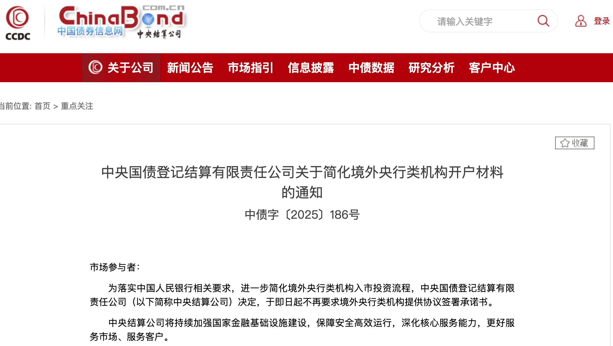 同日,全國銀行間同業拆借中心也發佈了《關於簡化境外央行類機構開户及聯網材料的通知》。該通知明確指出,為進一步提升境外央行或貨幣當局、國際金融組織、主權財富基金(以下簡稱境外央行類機構)投資銀行間債券市場的效率和便利,全國銀行間同業拆借中心自即日起簡化境外央行類機構開户及聯網材料,債券通模式及結算代理模式下均取消合規承諾函。