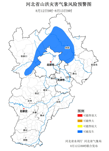 8月12日9時至8月13日9時,唐山市(遷西縣、遵化市)、承德市(灤平縣、雙橋區、雙灤區、鷹手營子礦區、承德縣、興隆縣、隆化縣、豐寧滿族自治縣、圍場滿族蒙古族自治縣、高新技術產業開發區、寬城滿族自治縣)、張家口市(蔚縣、懷來縣、涿鹿縣、赤城縣)等地局地可能發生山洪災害(藍色預警)。其他地區也可能因局地短歷時強降水引發山洪災害。