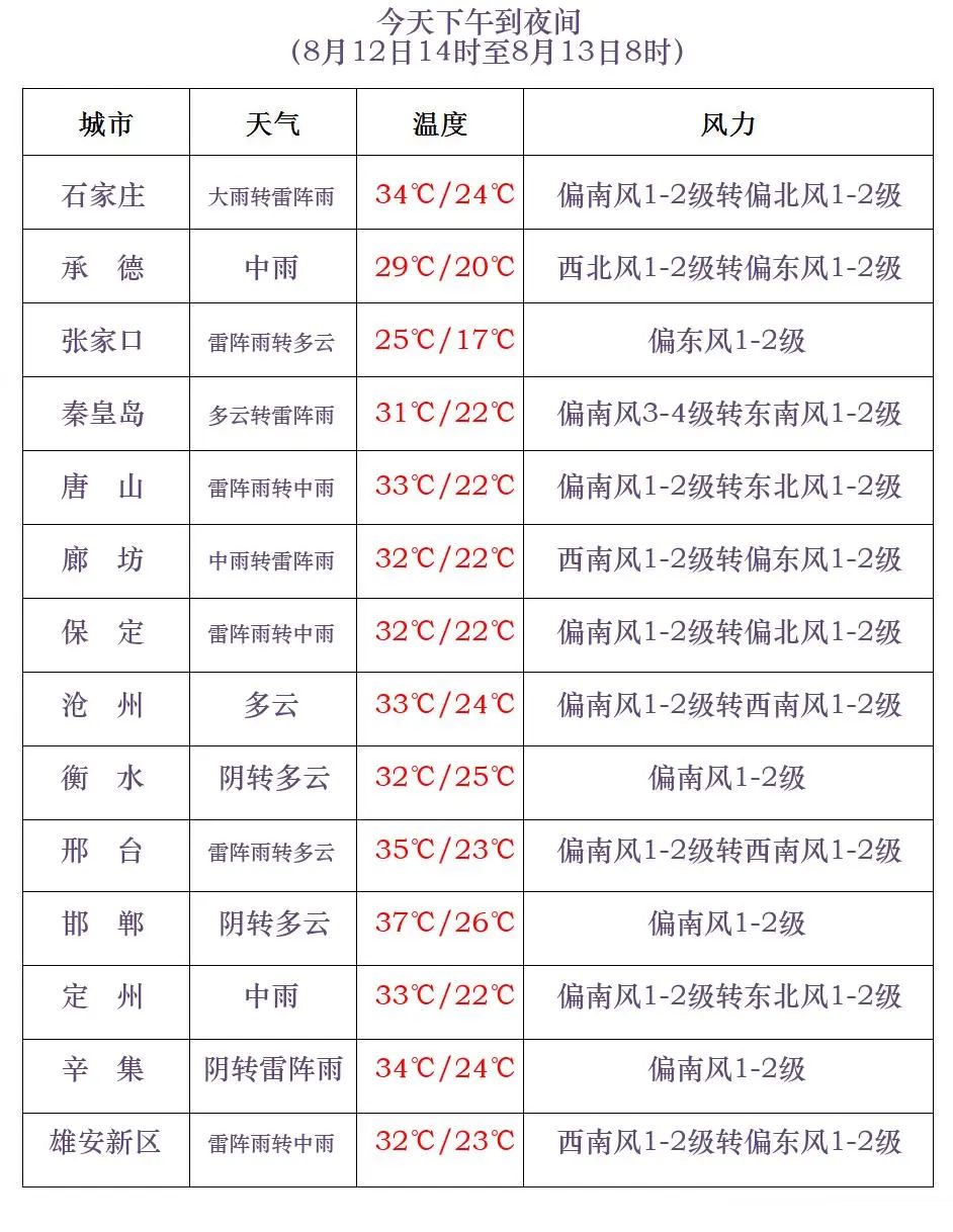 今天下午到夜間,石家莊、滄州及以北地區和衡水西部、邢台西部、邯鄲西部陰有雷陣雨或陣雨轉多雲,其中承德南部、唐山北部、保定東部、雄安新區、廊坊北部、石家莊東部有中到大雨,局地有暴雨,個別地點有大暴雨,雷雨時局地伴有短時大風、短時強降水等強對流天氣,其他地區多雲間晴。