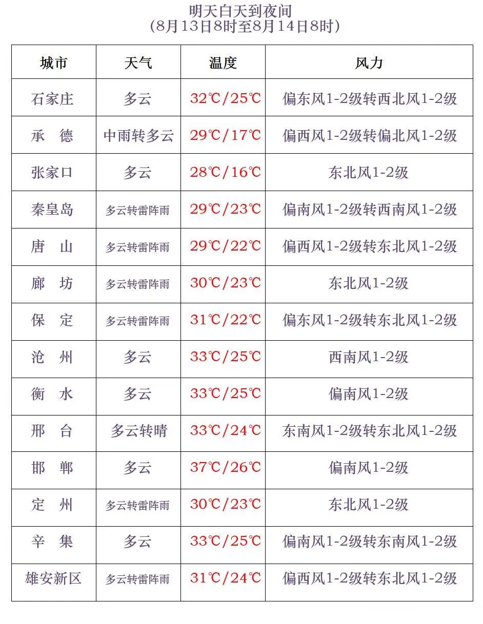 明天夜間到14日,保定、廊坊及以北地區和石家莊西部多雲間陰有雷陣雨或陣雨,其中承德南部、唐山北部、保定南部、石家莊北部的部分地區有中到大雨,雷雨時局地伴有短時大風、短時強降水等強對流天氣,其他地區多雲間晴。