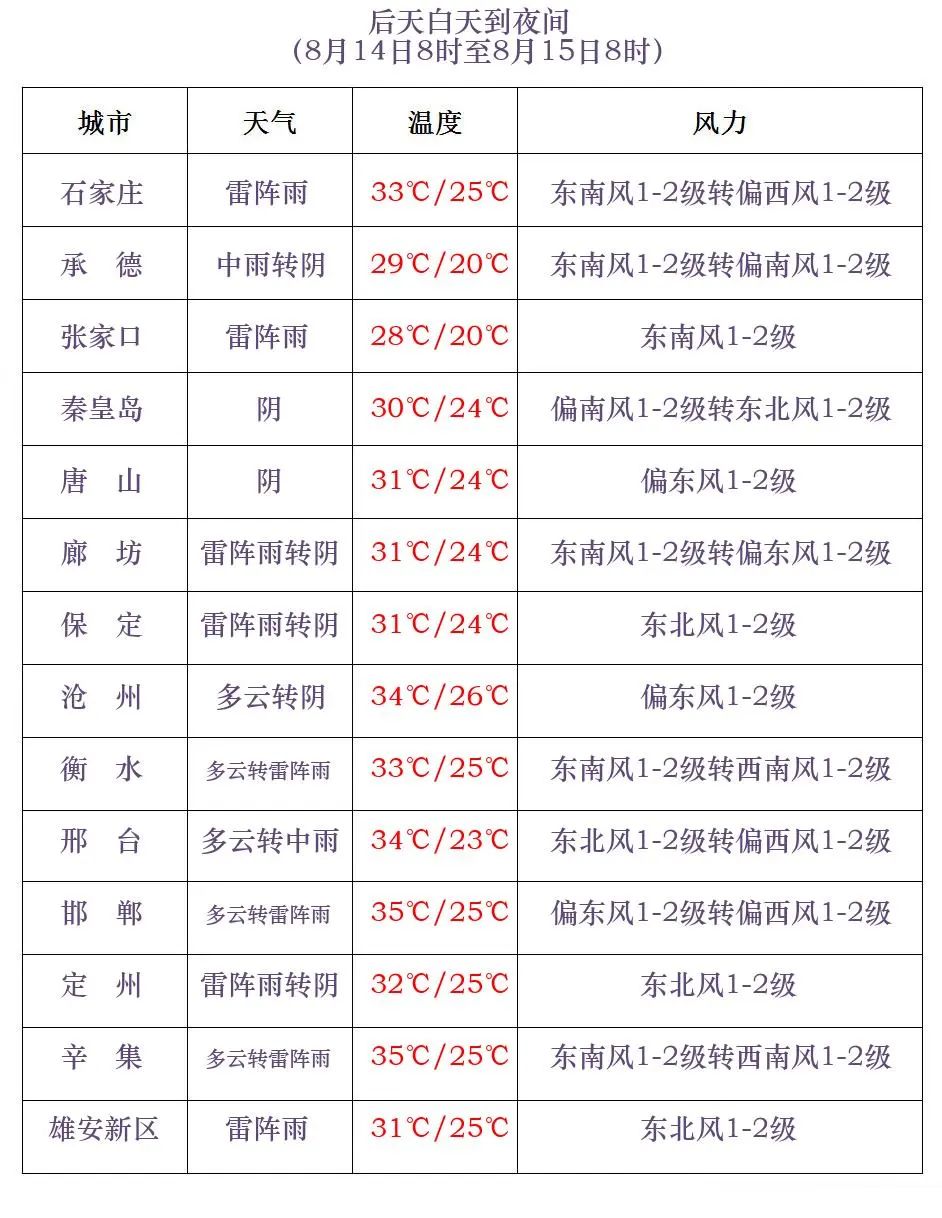 14日夜間到15日,全省陰,大部分地區有雷陣雨或陣雨,張家口、承德、石家莊南部、衡水南部、邢台、邯鄲有中到大雨。