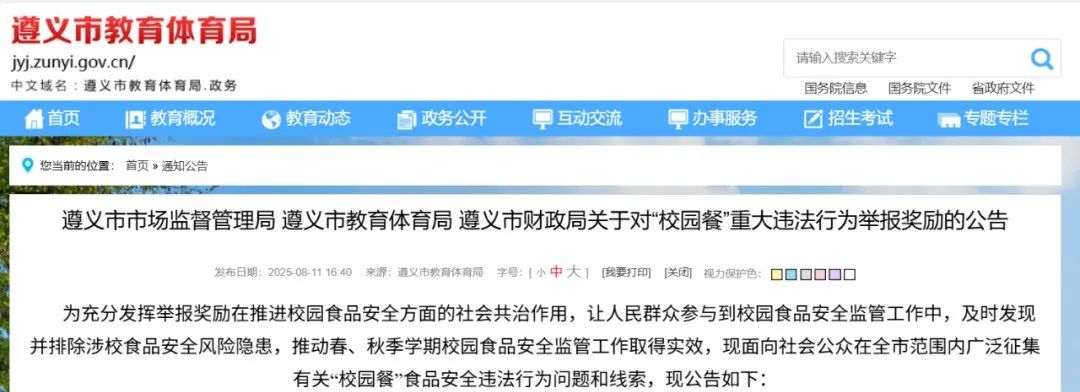 8月11日,遵義市市場監督管理局、遵義市教育體育局、遵義市財政局發佈關於對“校園餐”重大違法行為舉報獎勵公告。