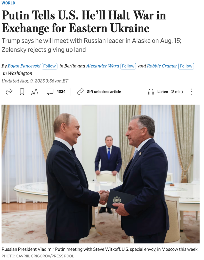 △《華爾街日報》報道,普京要求以停戰換取烏克蘭東部領土,但澤連斯基拒絕放棄領土。