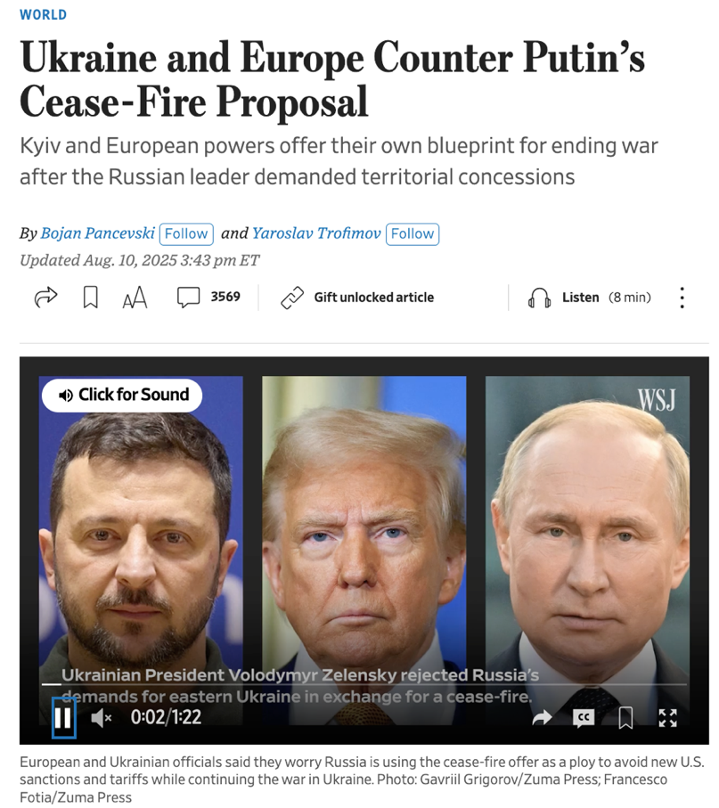 △《華爾街日報》報道,烏克蘭和歐洲反對普京的停火建議,同時擔心俄羅斯在利用停火談判逃避制裁。