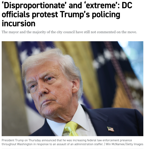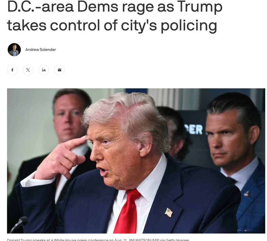 △美國數字新聞媒體Axios報道,特朗普對特區警局的接管引發了民主黨憤怒。