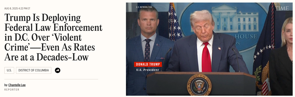 △美國《時代》雜誌網站報道,儘管華盛頓特區的犯罪率在下降,但特朗普依然要在特區部署聯邦執法力量。