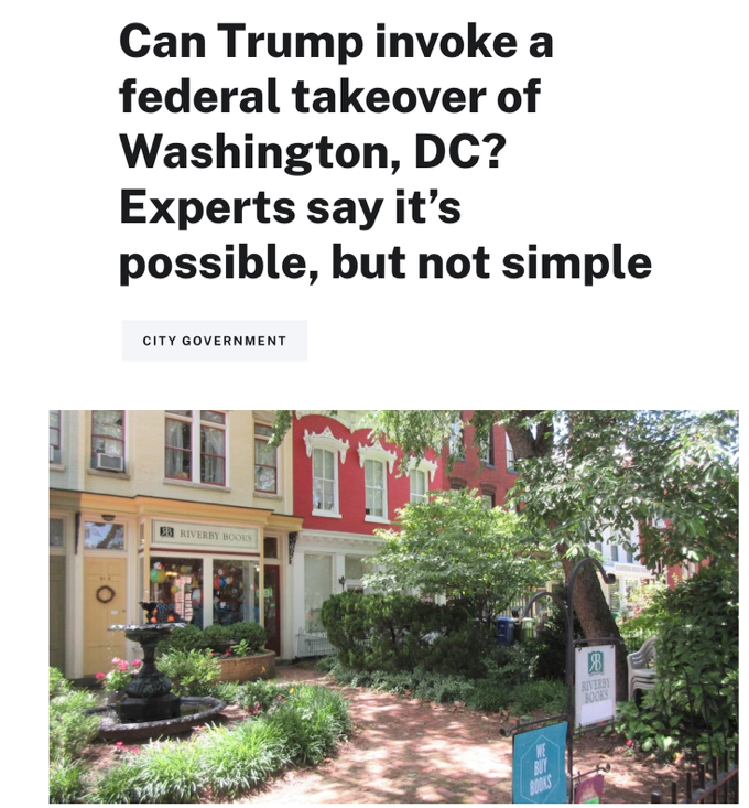 △美國政治時事核查媒體“政治事實”網站(PolitiFact)報道,特朗普想長期接管特區談何容易。