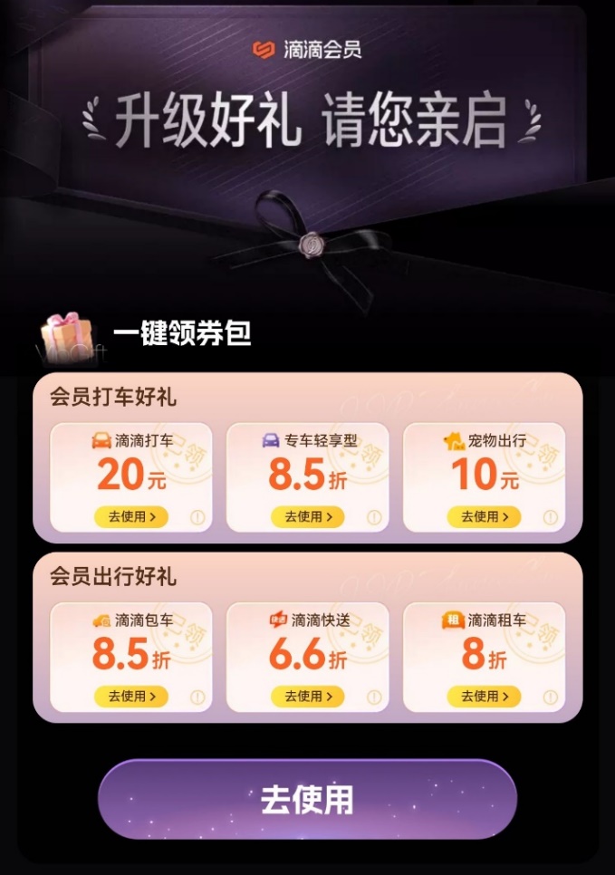 為方便用户出行,滴滴會員每月可免費領取打車券包,覆蓋通勤、休娛、差旅等用車場景。升級期間,用户進入滴滴會員頁面可限量領取會員升級好禮券包,最高價值300元,不同等級會員領取的券包有所差異。