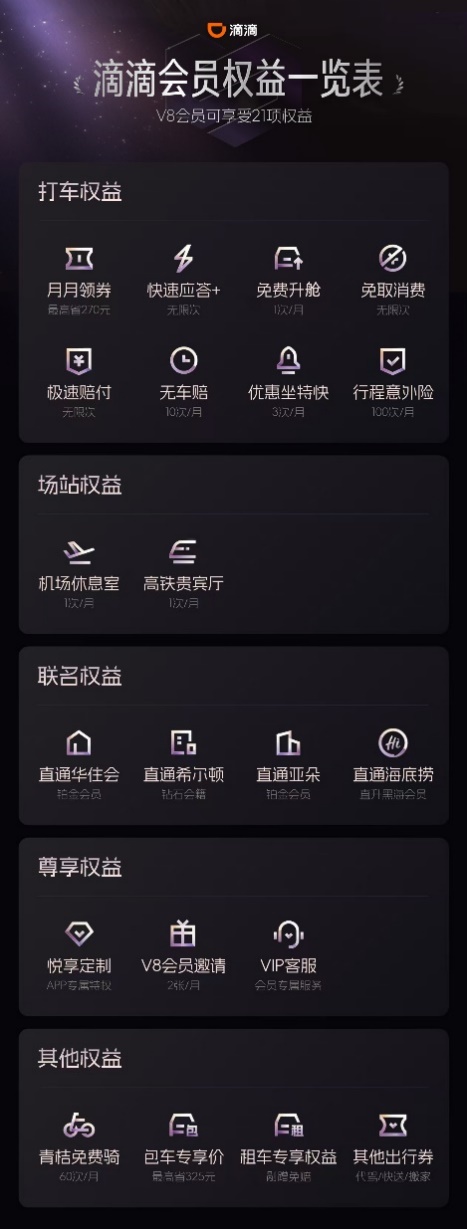 此次升級後,滴滴會員體系與海底撈、希爾頓、亞朵、華住會等品牌打通會員體系,實現等級互通與權益共享。