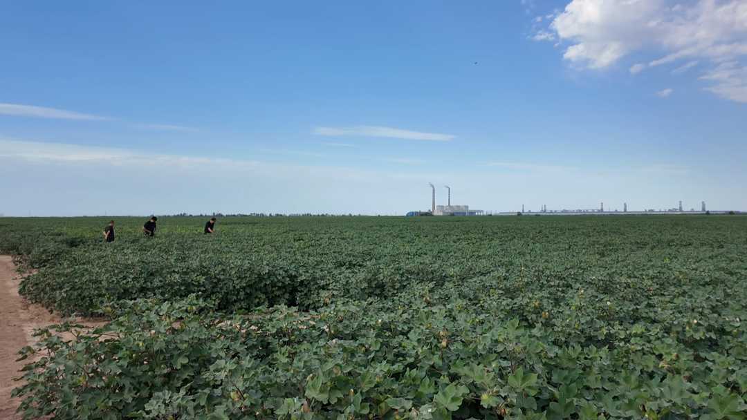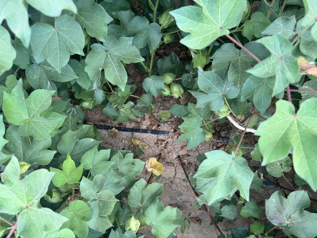 8月10日,新疆瑪納斯縣包家店鎮的農田裏,棉花植株上掛滿了核桃大的棉桃。撥開棉花茂盛的枝葉,能看到順着棉花植株縱向排開的一條條手指粗的黑色軟管。