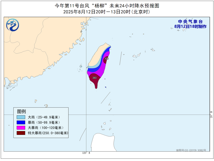 *降水預報:*8月12日20時至13日20時,台灣島大部地區有大到暴雨,其中,台灣島東部和南部的部分地區有大暴雨,局地特大暴雨(250~380毫米)。