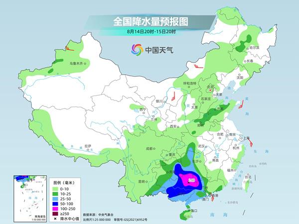 14日20時至15日20時,廣西大部、廣東西北部、湖南南部、貴州東部等地的部分地區有暴雨或大暴雨。