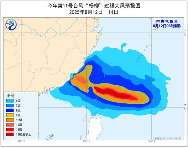 12日至14日,台灣以東洋麪、巴士海峽、台灣海峽、南海東北部、東海西南部等海域及台灣島大部、福建南部、廣東東部沿海地區將有8至10級風,颱風中心經過附近海域及地區風力可達11至14級、陣風15至16級。