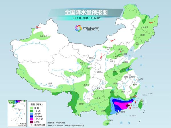 13日至15日,台灣島、福建南部、廣東、廣西、江西南部、湖南南部、貴州有大到暴雨,部分地區大暴雨,局地特大暴雨,部分地區累計降水量100至250毫米,局地300至400毫米。