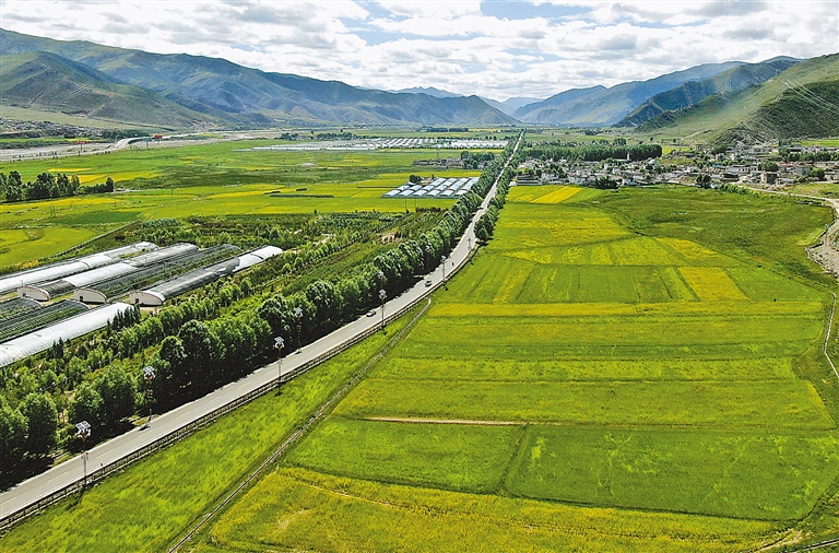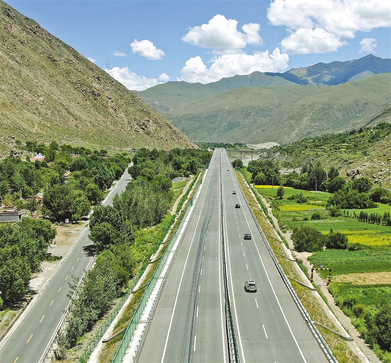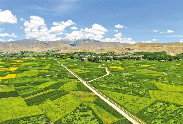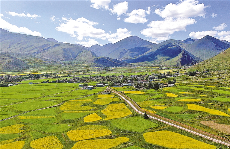 盛夏時節,驅車行駛在拉薩市墨竹工卡縣的鄉村公路上,兩側金黃的油菜花海與黝黑的柏油路相映成趣,滿載青稞的農用車與色彩鮮豔的農村客運班車擦肩而過,勾勒出一幅流動的豐收圖景。這樣的景象在如今的西藏鄉村已成為常態,一條條嶄新的公路正悄然改變着高原大地的面貌。