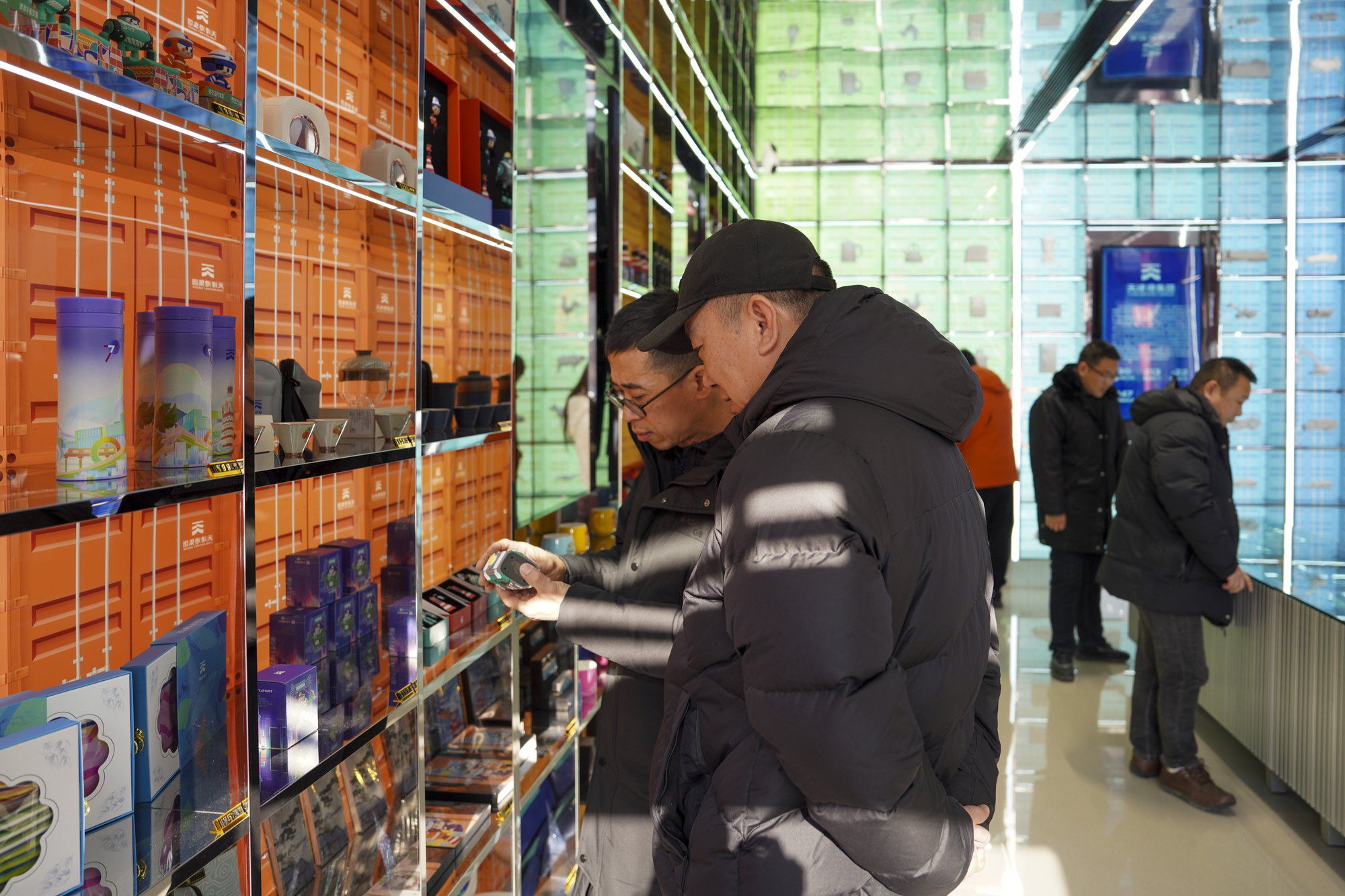20世紀80年代與21世紀初的兩次整修,讓古老的街區重現飛檐斗拱;2024 年“微更新”工程後,天津民俗博物館與天后宮連成一片,成為首批國家級歷史文化街區保護典範,更令人驚喜的是“津港印象”展示體驗項目的落地——2024年,在天津建衞620週年之際,“津港印象”在古文化街落成運營,該項目融匯海河文化與漕運文化,在古文化街這片歷經歷史浸潤的土地上記錄下天津港口和城市發展歷程,以其獨特的方式訴説着天津從漕運碼頭到現代海港的變遷,成為展現河海文化與港產城融合的一扇窗口。彩色集裝箱服務枱旁,遊客正操控模擬碼頭設備;在負一層的沉浸式影片裏,漕運碼頭與現代港區瞬間切換。“原來天津港和古文化街早就是一家人。”一位遊客的感嘆,道出了河海文化的當代共鳴。